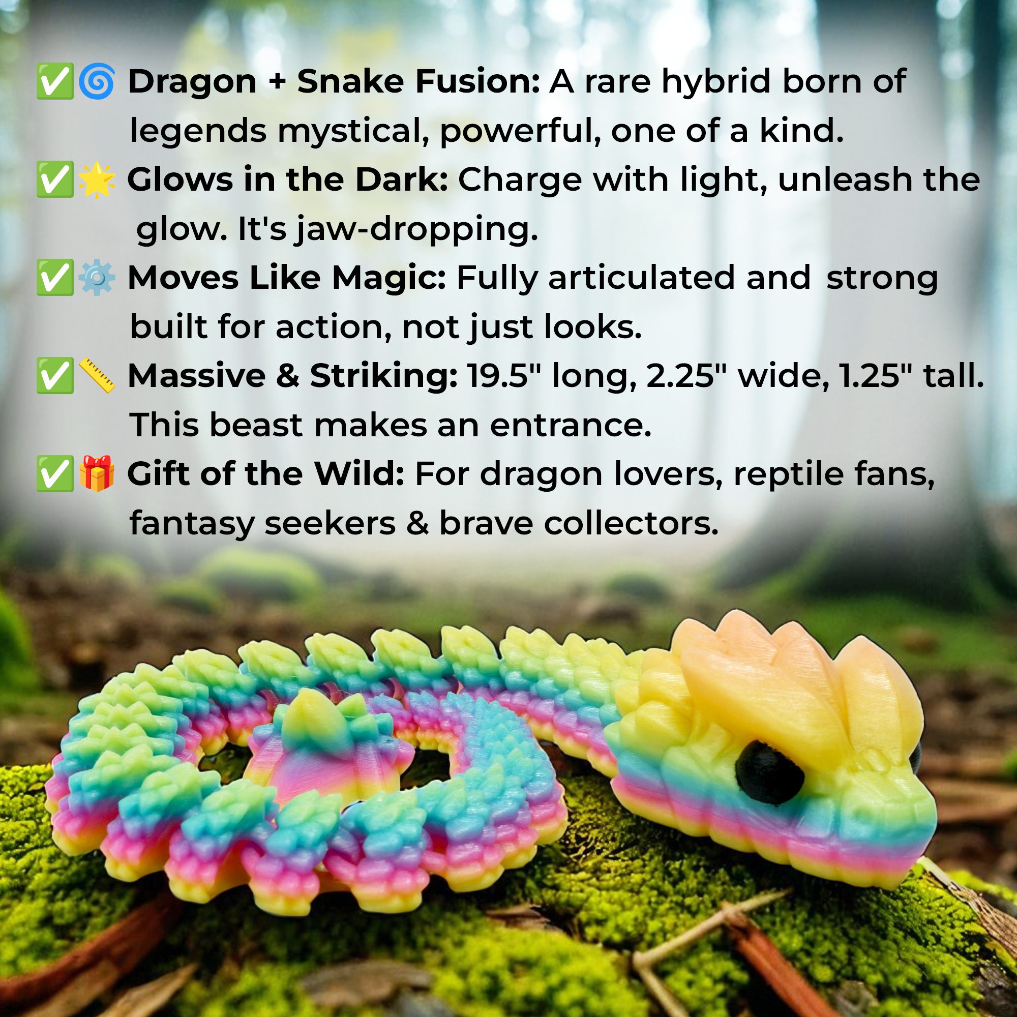 Unleash the magic of legend with the Mythic Glow Dragon Serpent – a rare fusion of dragon and snake, born of myth and molded for collectors, dreamers, and adventurers.