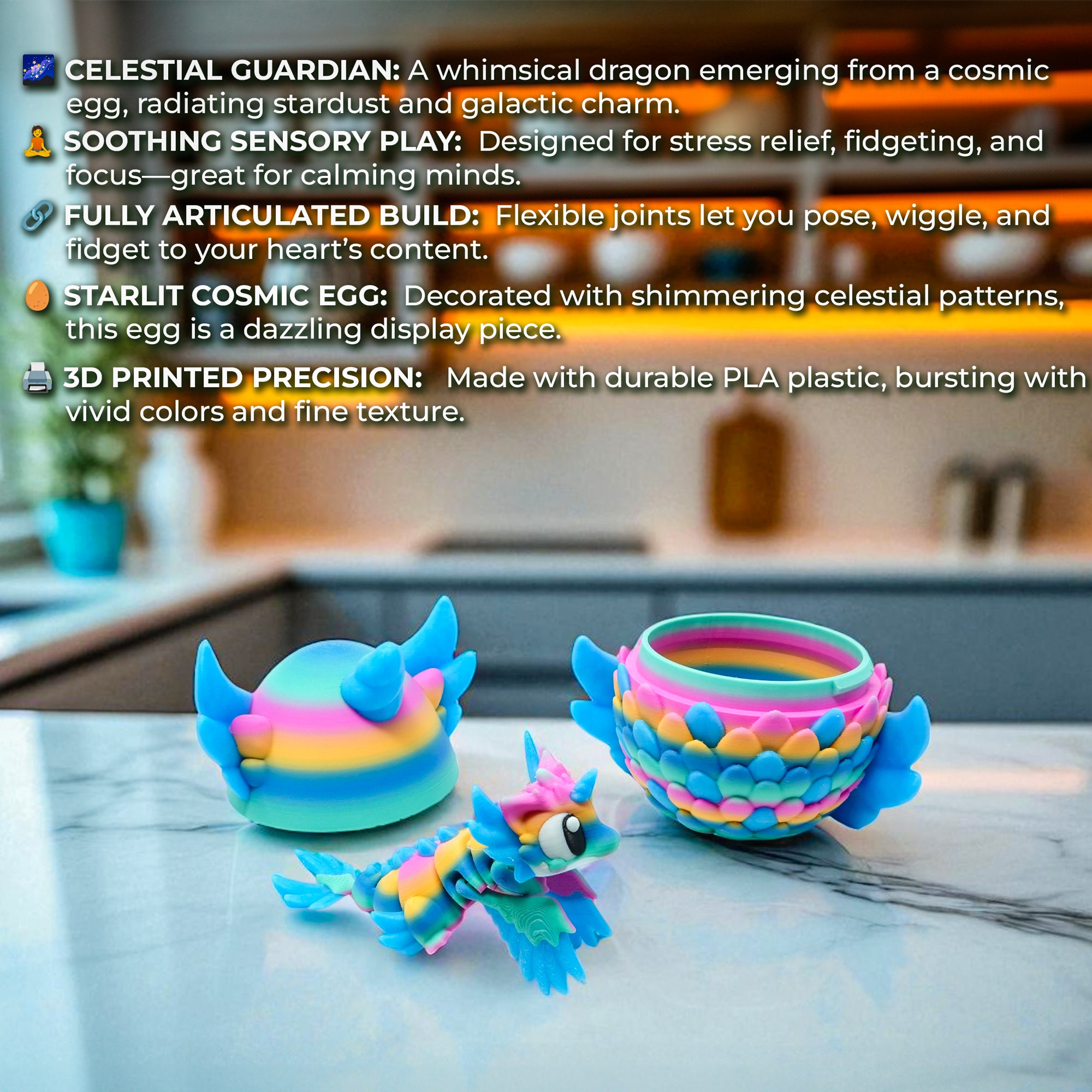 Born from the stars, the Celestial Guardian is a magical dragon that emerges from a cosmic egg, shimmering with galactic charm. It's more than a collectible—it’s a calming, starry companion for display or play.