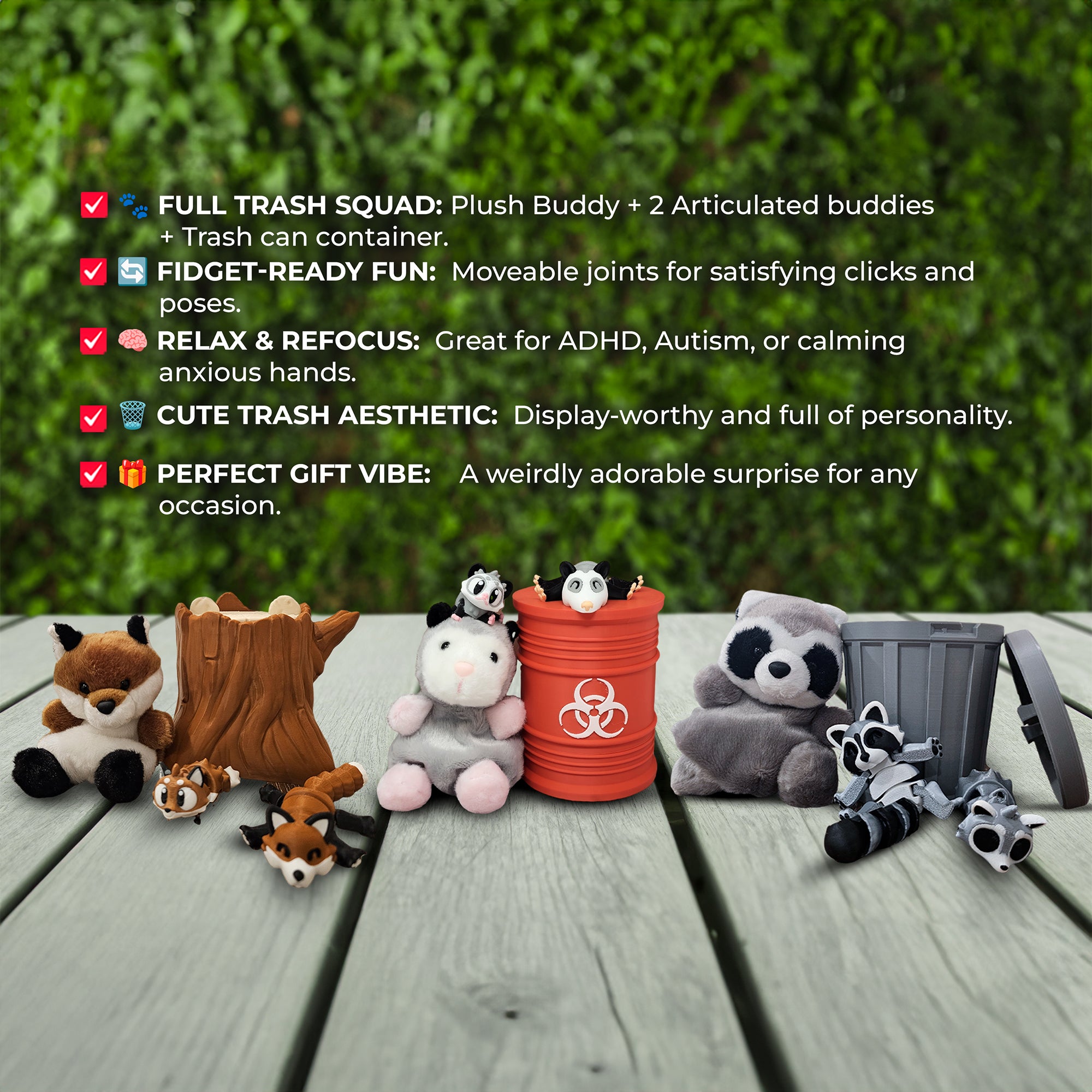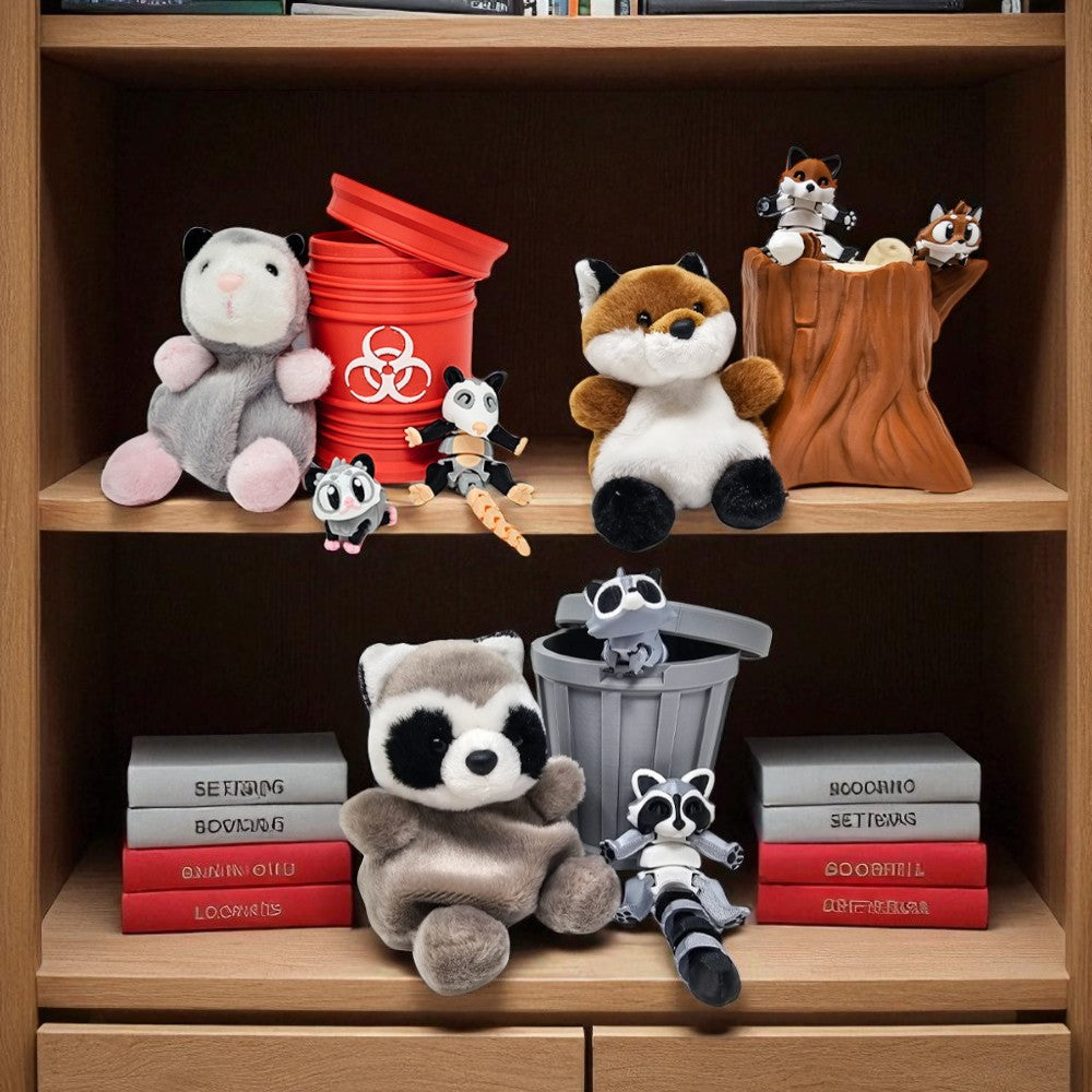 Meet the ultimate mischief-makers: the Trash Squad Bundle brings you the full chaotic trio—Raccoon, Fox, and Opossum! Packed with fidgety fun, cuddly charm, and display-worthy style, this set is made for collectors, sensory seekers, and anyone who appreciates adorable chaos.