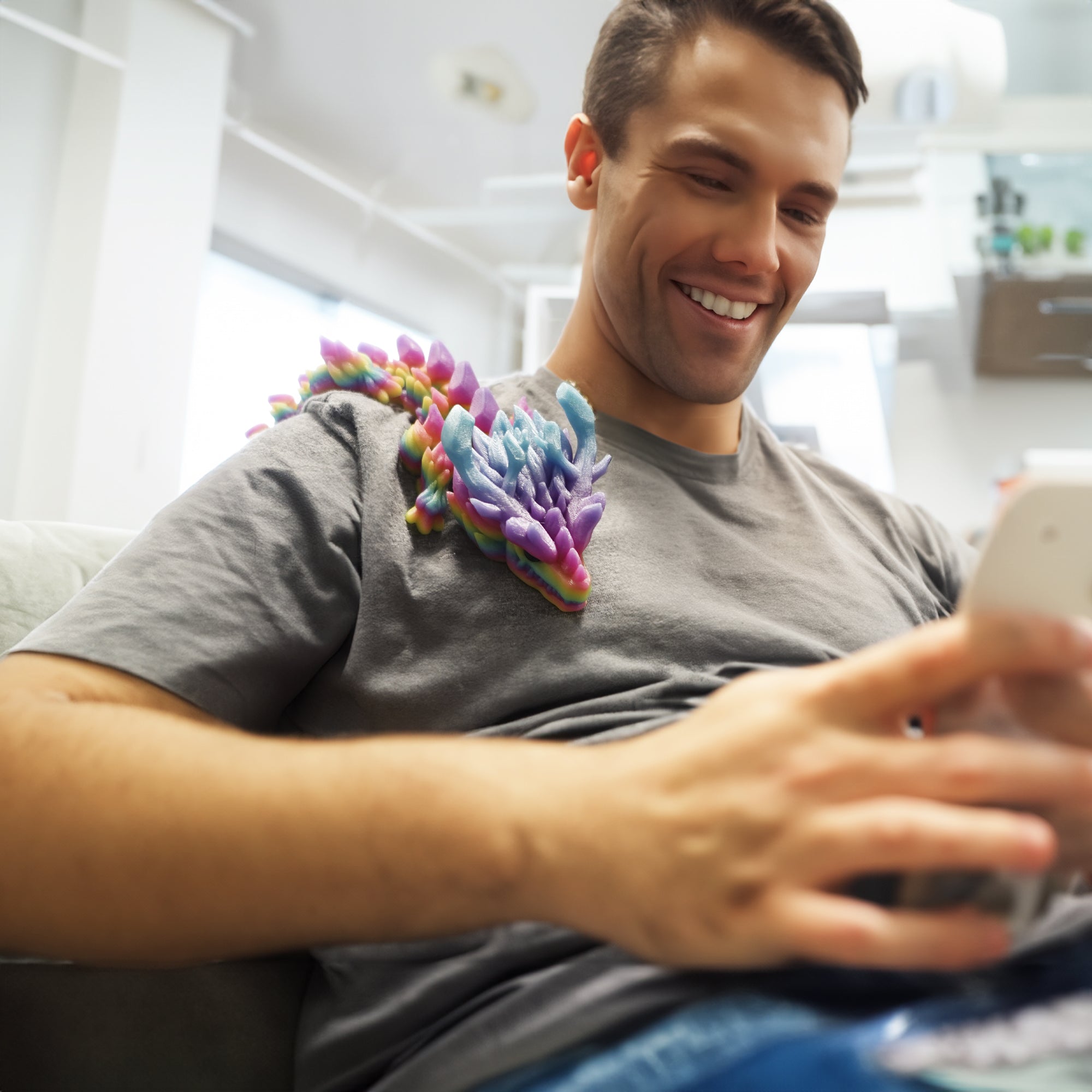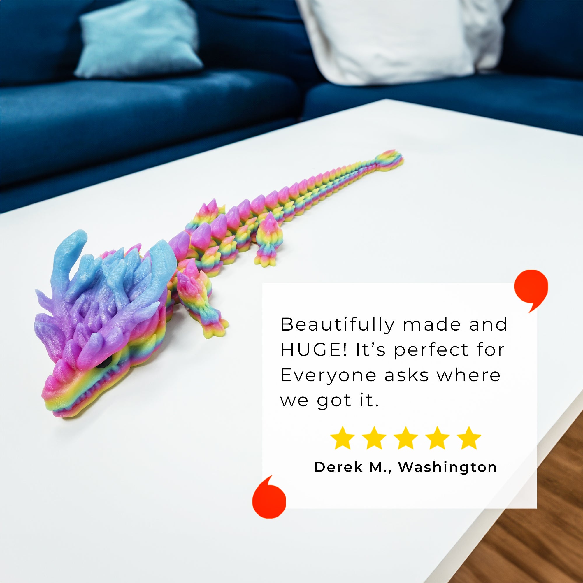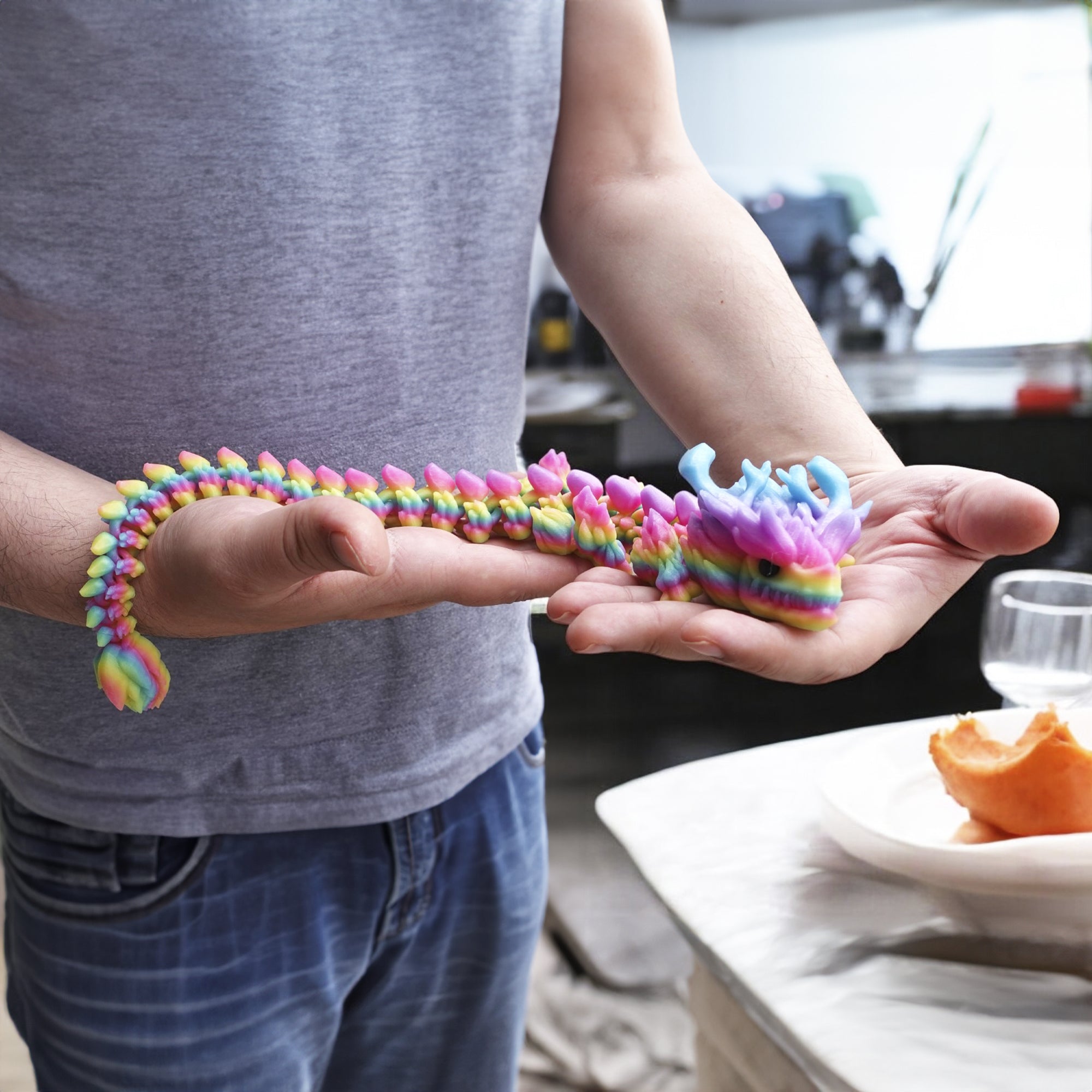 Colorful by Day – Made with rainbow filament, this dragon looks striking and cheerful in daylight.